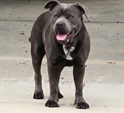 Dark grey with white patch on chest, light eyes, in-tact male, pit-staffy-Corso-ish mix. No collar. Medium size ~45-50lb wandering @ Waxwood & Tanglewood 78216